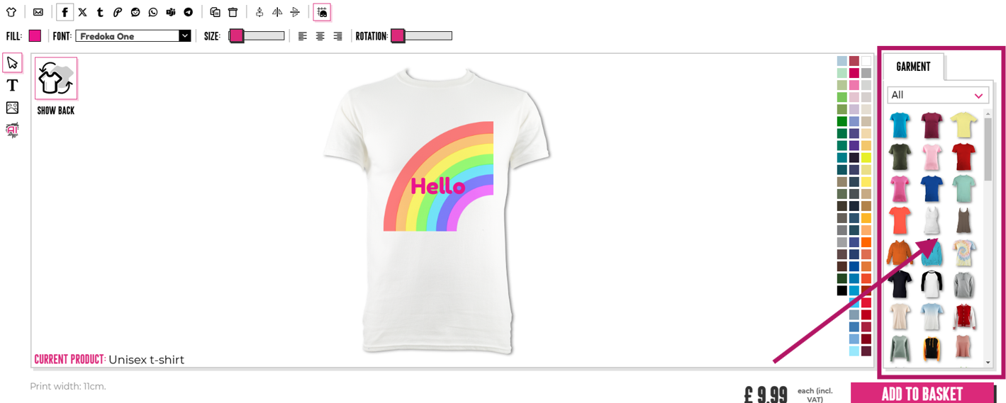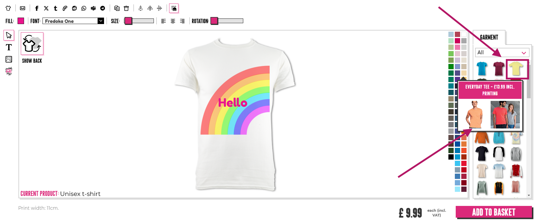 Kad uzvedīsiet peli virs izvēles, tiks parādīts apģērba nosaukums un vienpusējās drukas cena.