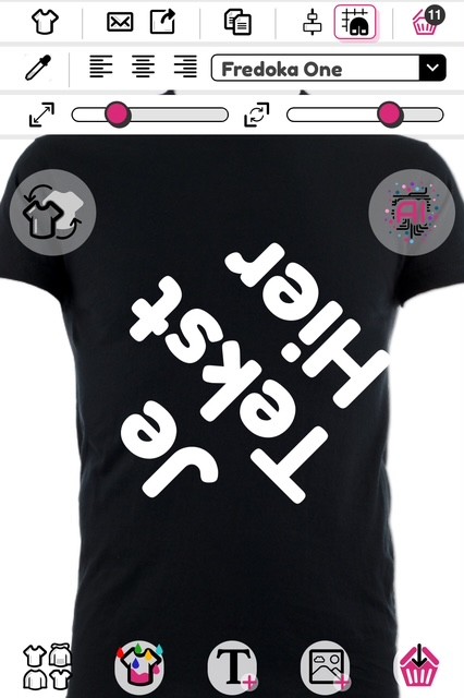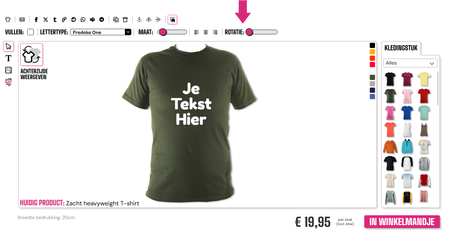 Om een afbeelding of tekst te roteren, gebruik je de 'rotatie' schuifbalk rechtsboven in de ontwerper.