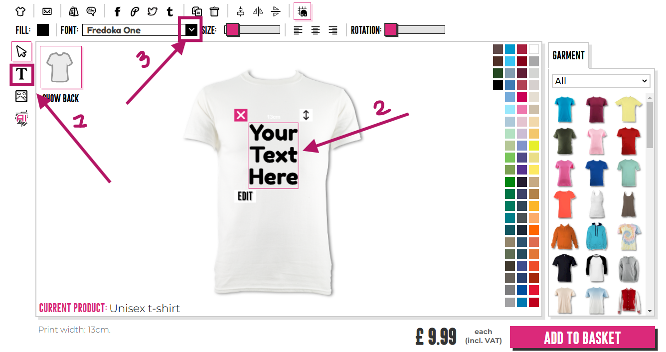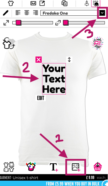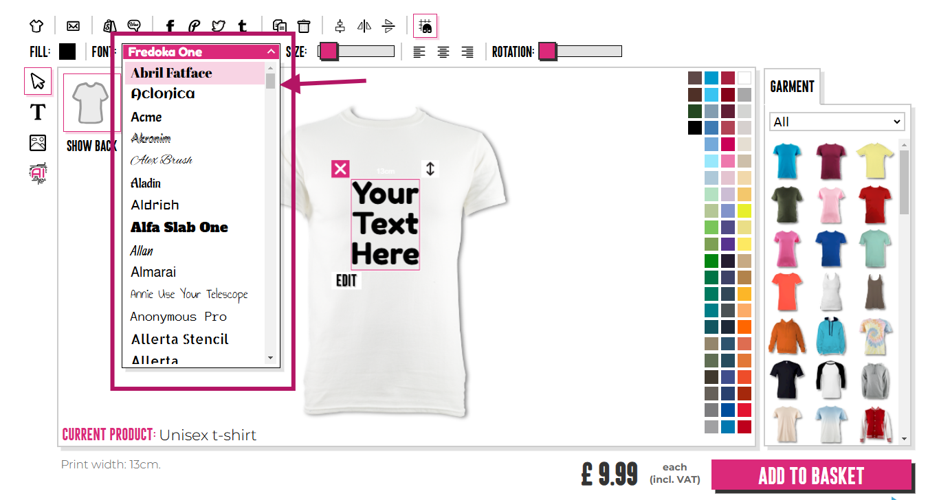 Aby wybrać styl czcionki, musisz kliknąć "T" na dole projektanta, aby wyświetlić tekst, jeśli jeszcze tego nie zrobiłeś, a następnie kliknąć ten tekst, aby go zaznaczyć. Następnie musisz kliknąć strzałkę w dół w sekcji czcionki, która znajduje się na górze projektanta. Domyślną czcionką jest "Fredoka One"