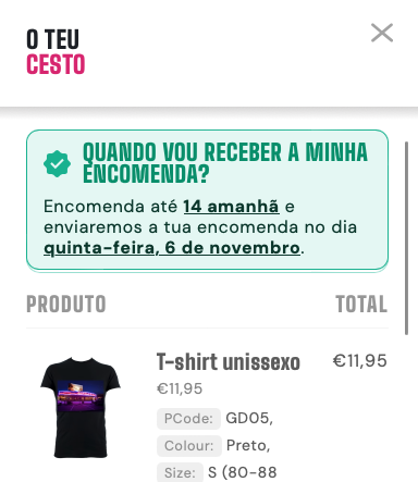 O cesto dar-te-á todos os detalhes da Estimativa de Envio, o tipo de entrega e a data em que receberás a encomenda. Também mostrará quais das nossas garantias de envio e/ou entrega se aplicam. Certifica-te de verificar tudo antes de finalizares a encomenda, para garantires que escolheste o serviço de entrega adequado às tuas necessidades.