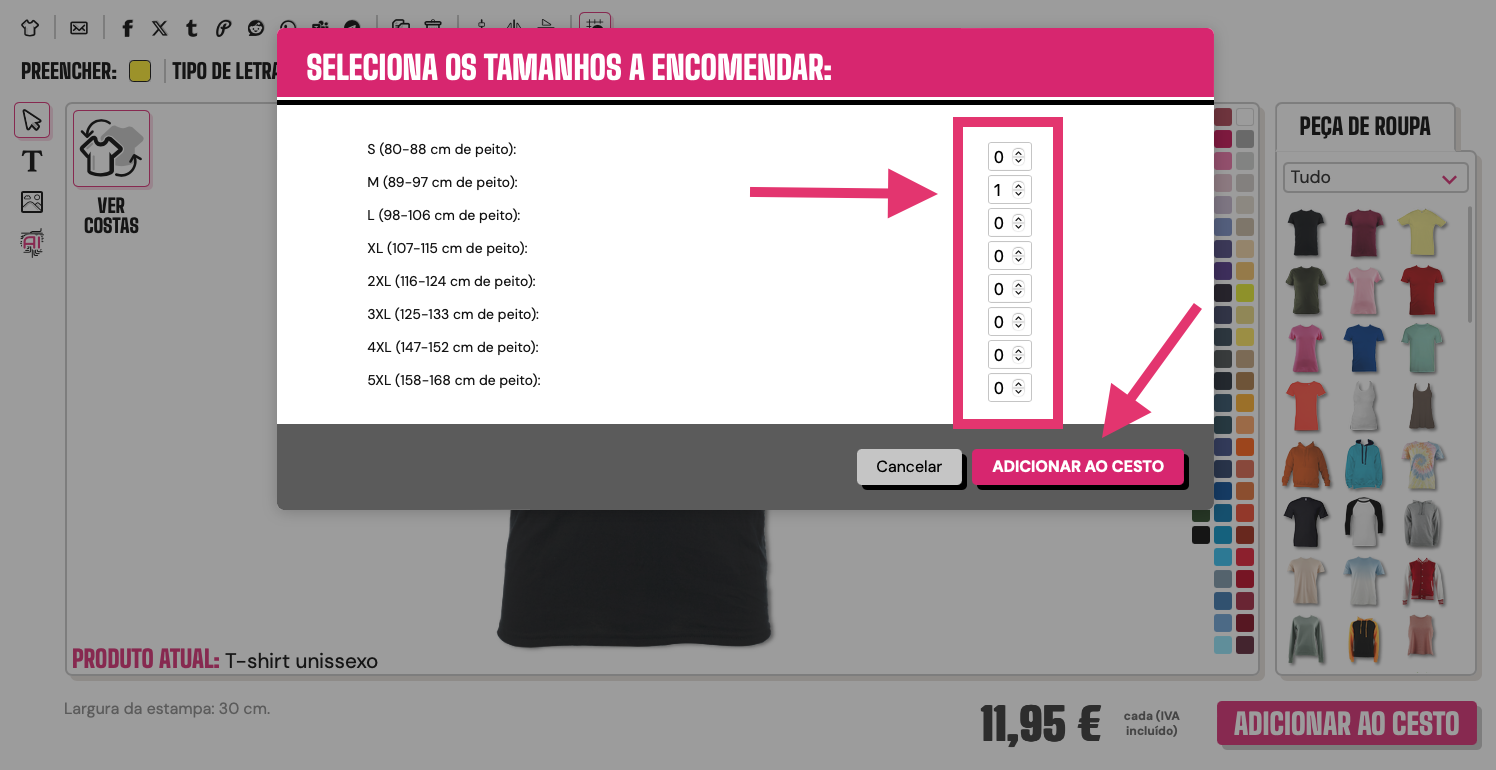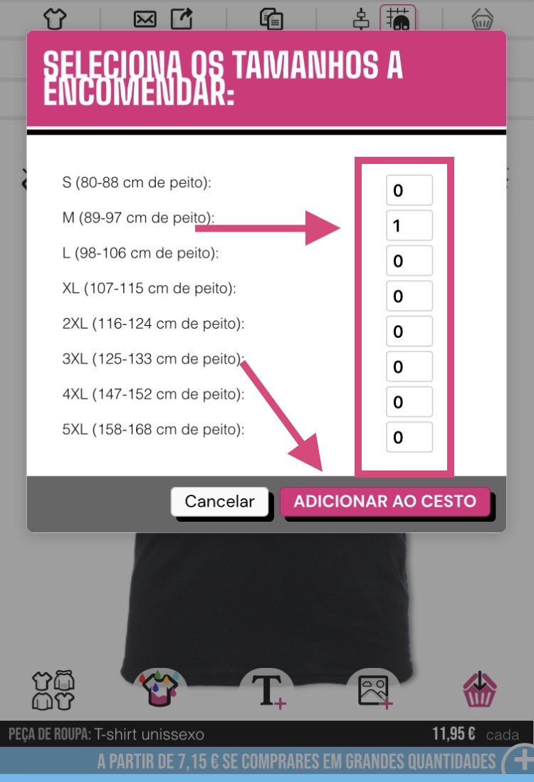 Seleciona o tamanho da peça de roupa e o número de peças que desejas encomendar. Depois, toca na opção "Adicionar ao cesto":
