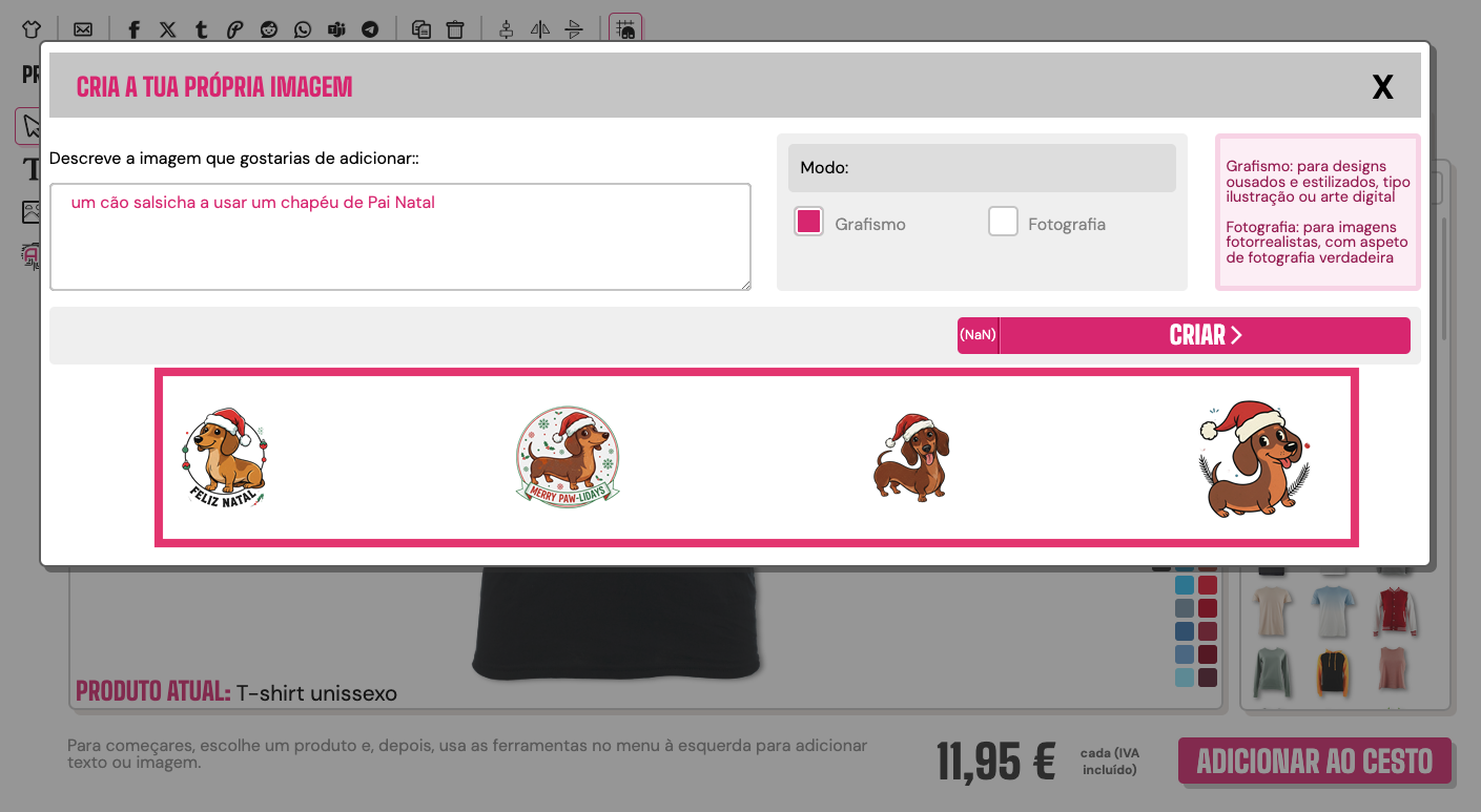 - Aqui podes descrever a imagem que gostarias de criar. Neste exemplo, vamos pedir um cão salsicha a usar um chapéu de Pai Natal.