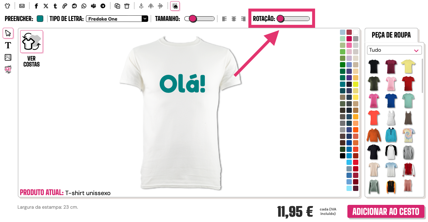Para rodares uma imagem ou texto, deves usar o rato e a barra deslizante no canto superior direito do Editor.