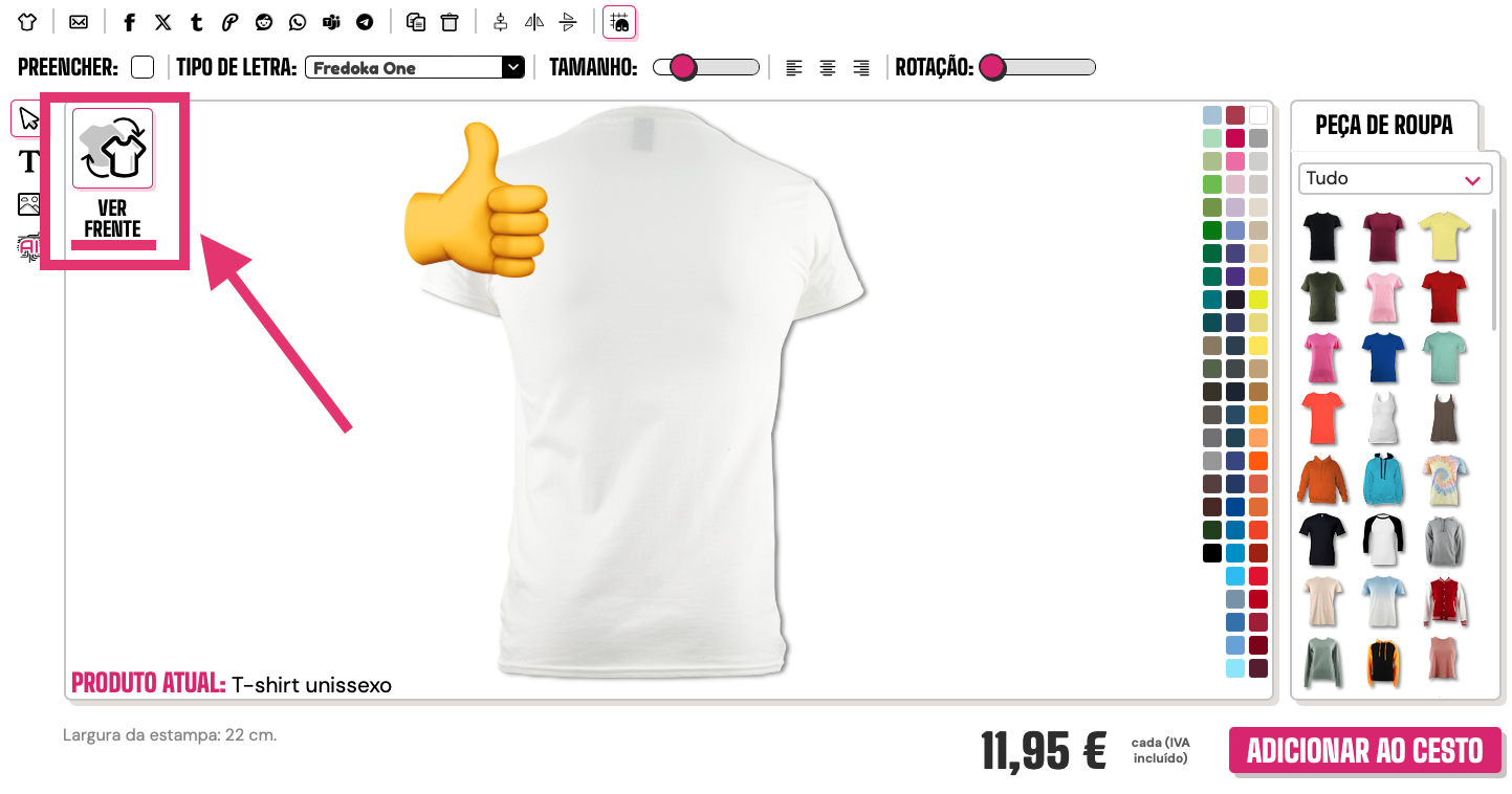 Ao clicares no botão, a t-shirt vira e consegues adicionar um design às costas da t-shirt.