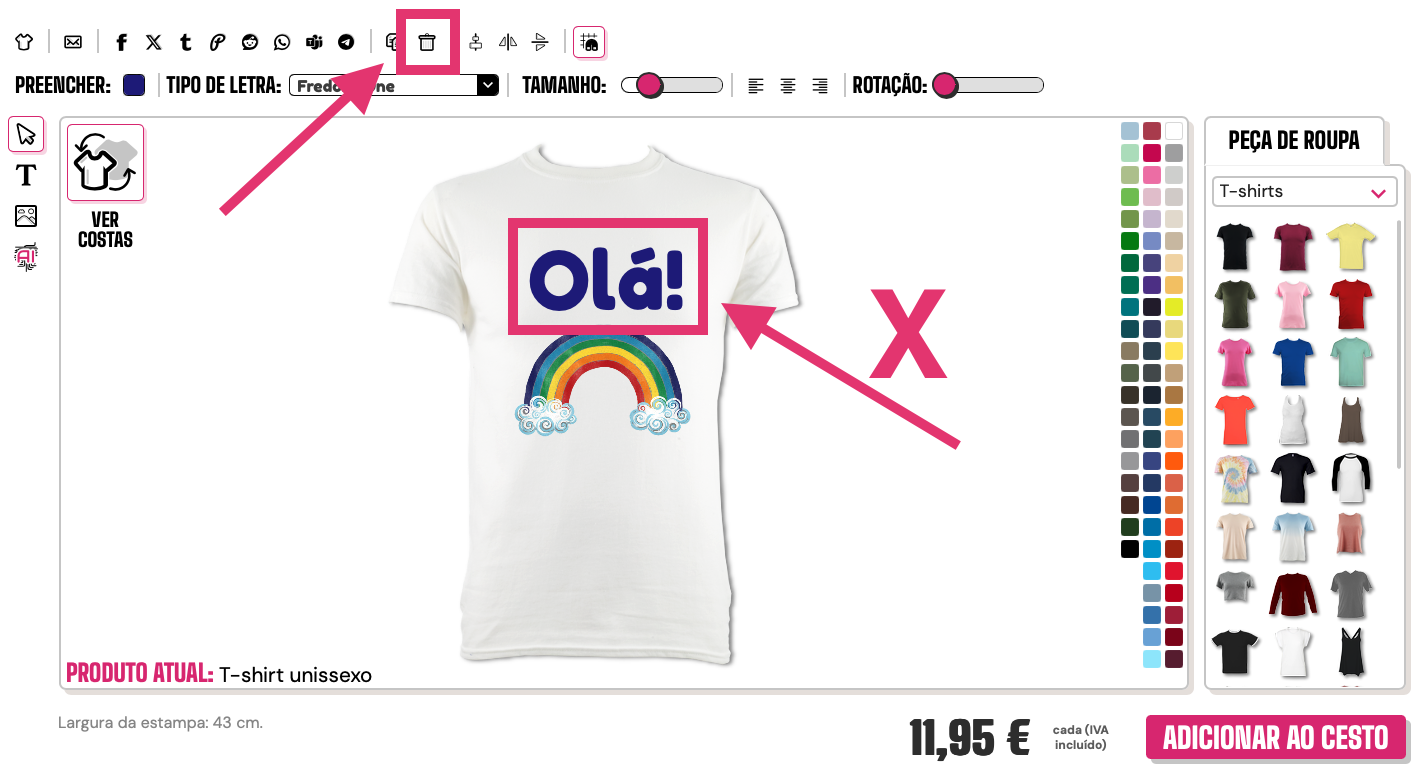 Para eliminar uma imagem ou uma caixa de texto, podes clicar no ícone do caixote do lixo, localizado no topo do Editor.