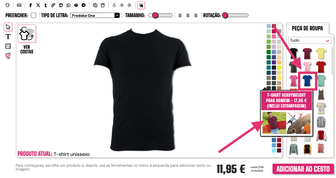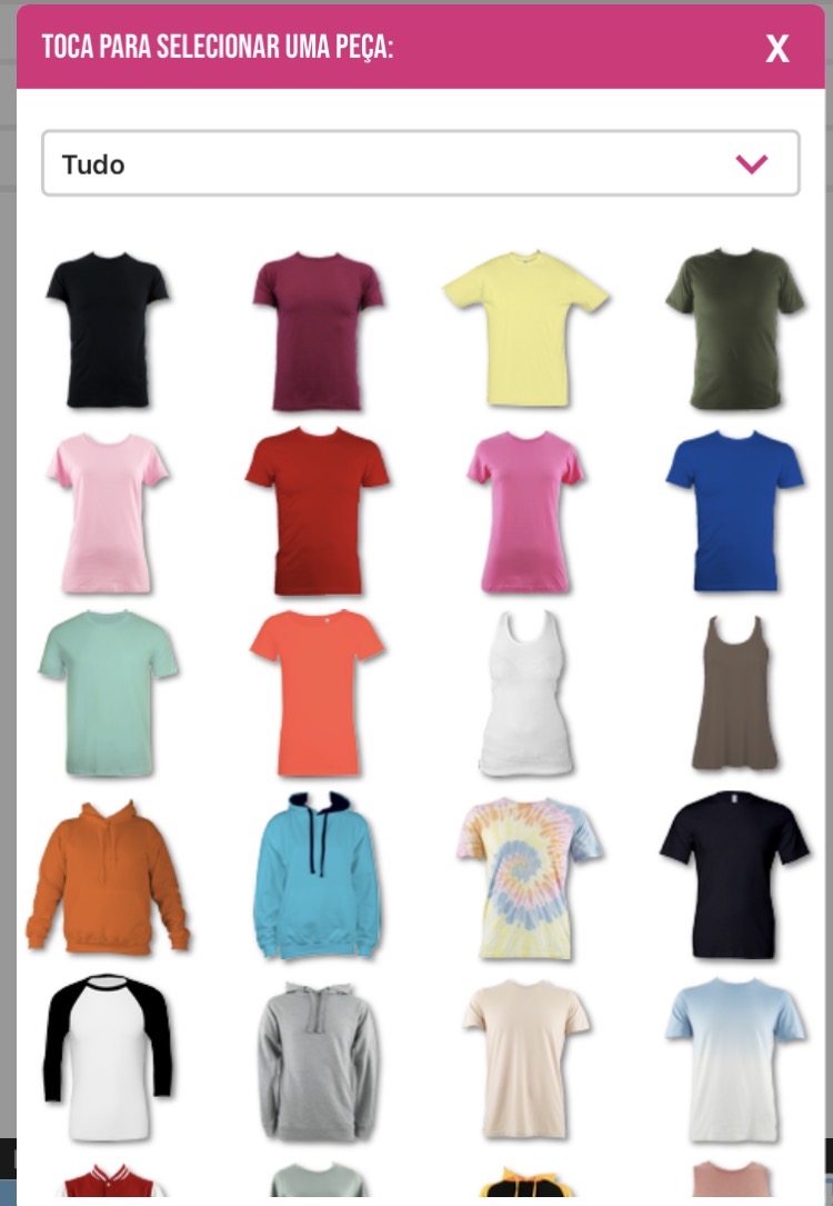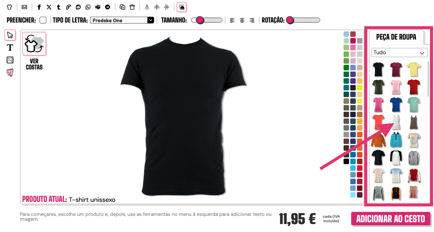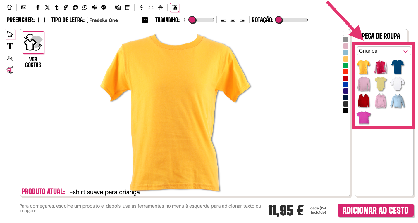 Para escolheres uma peça de roupa, usa o menu à direita do Editor, chamado "PEÇA DE ROUPA".