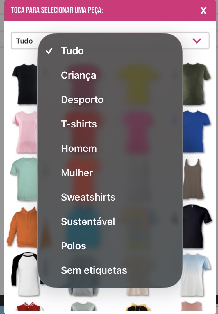 Podes usar o menu suspenso para selecionar uma categoria. Por exemplo: se quiseres ver apenas produtos de criança, seleciona a opção "Criança":