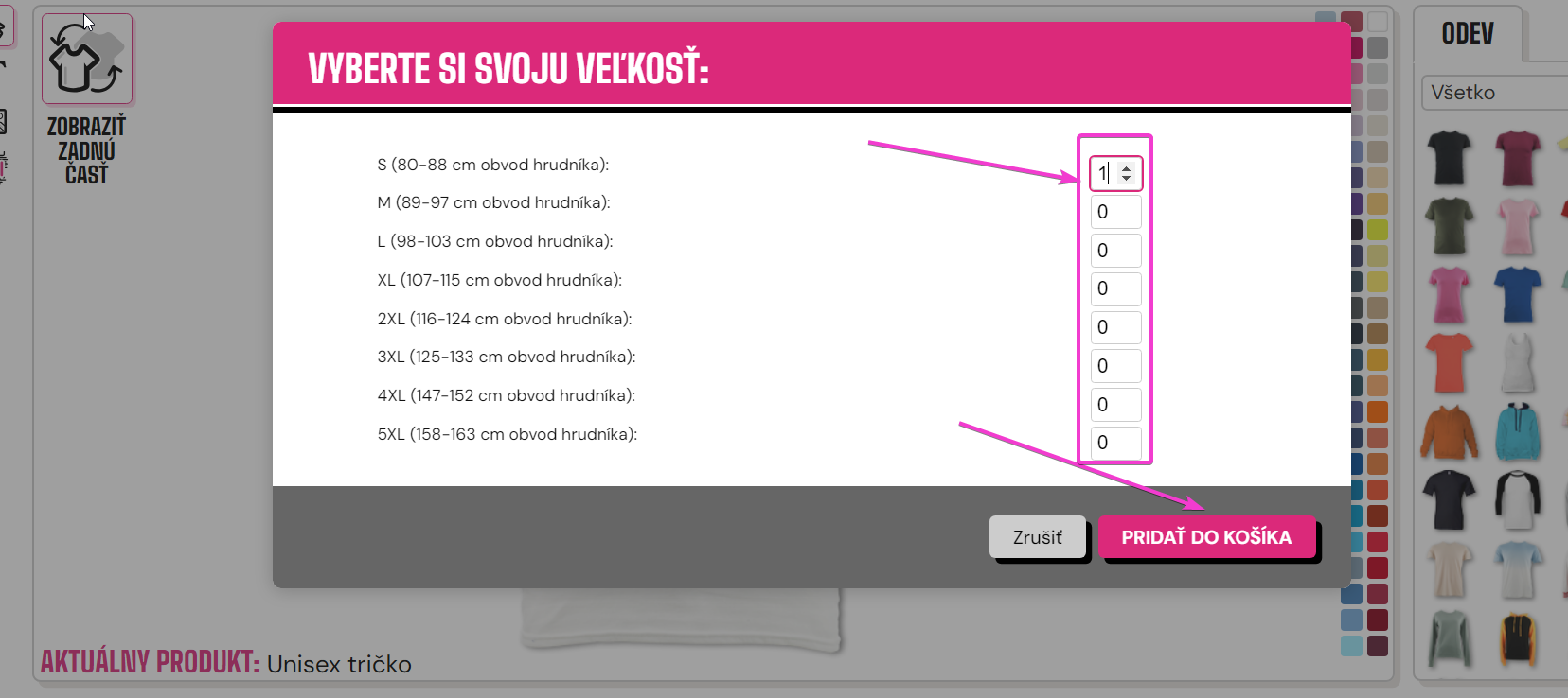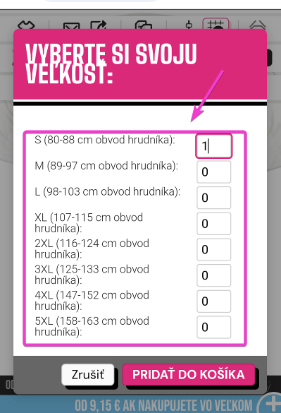 Vyberte si veľkosť, ktorú chcete, zadaním požadovaného počtu alebo stlačením šípky hore (táto sa objaví, keď prejdete myšou nad oblasťou) na zvýšenie množstva.