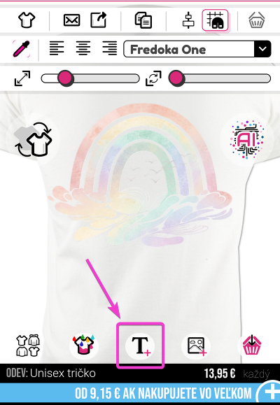 Ak chcete pridať text na váš odev, kliknite na symbol "T+" v dolnej časti dizajnéra.