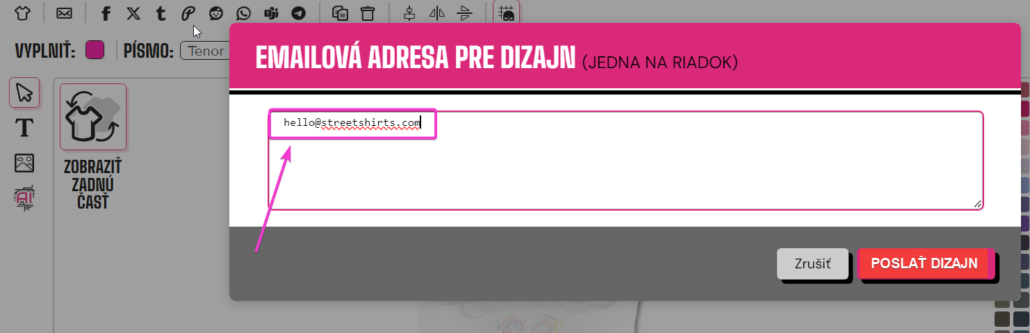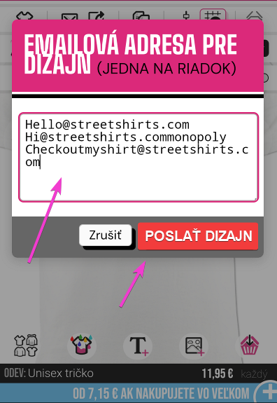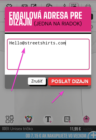 Môžete si to poslať e-mailom sebe alebo dokonca priateľovi na kúpu. Zadajte e-mailovú adresu, na ktorú chcete návrh uložiť/odoslať, a kliknite na "EMAILOVÁ ADRESA PRE DIZAJN"