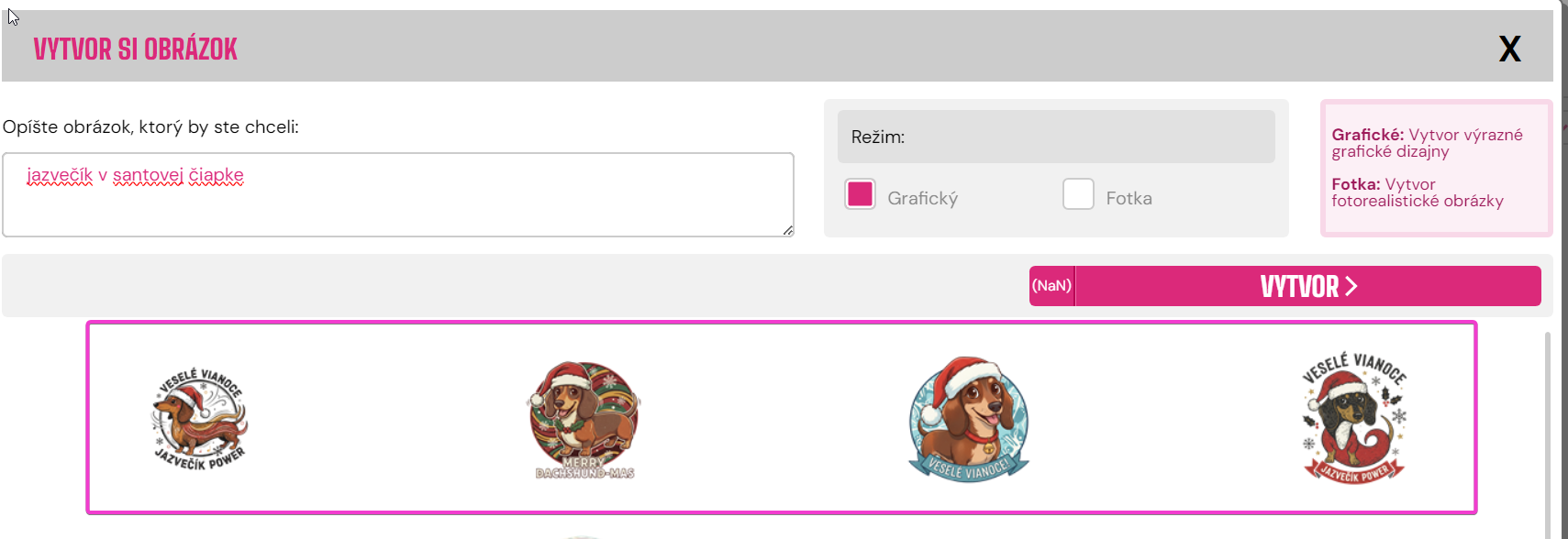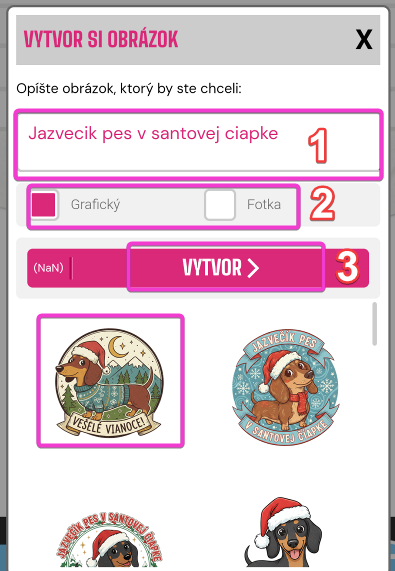 - Tu môžete napísať, čo chcete - ako príklad je uvedený jazvečík v santovej čiapke. Ak by ste to chceli, napíšte do okna "jazvečík v santovej čiapke".