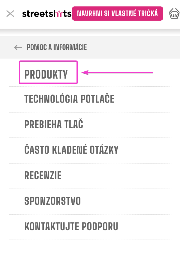 Ak chcete nájsť viac informácií o našich produktoch, prejdite na "POMOC A INFORMÁCIE" v hornej časti obrazovky a vyberte "PRODUKTY".
