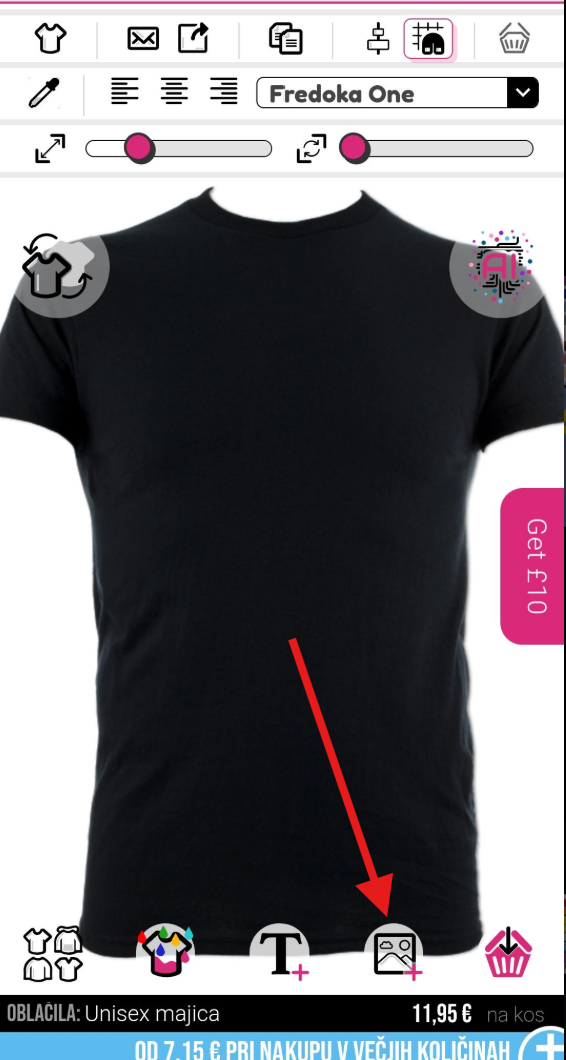 Če želite dodati slike na svoje oblačilo, morate poskrbeti, da so v formatu PNG ali JPEG in manjše od 20 MB. Ko ste pripravljeni na nalaganje, morate klikniti gumb za dodajanje slik. (ta izgleda kot hribi in oblaki in se nahaja tik pod "T" na levi strani oblikovalca)