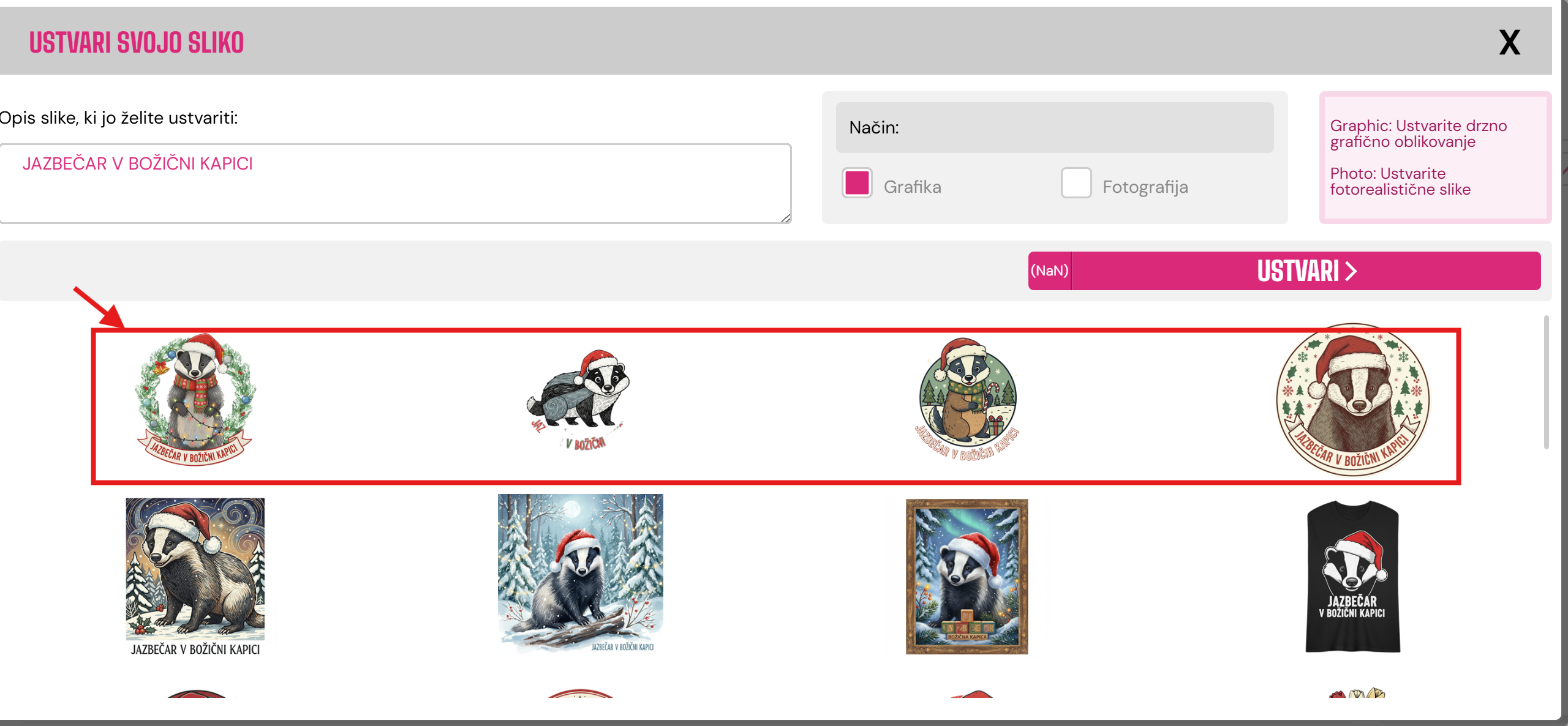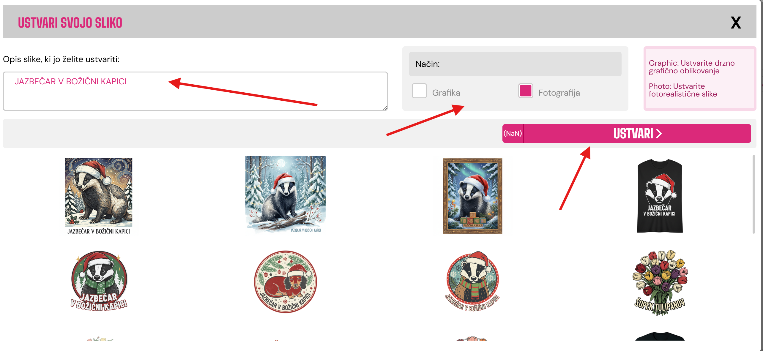 - Tukaj lahko napišete, kar želite - prikazan je primer jazbečarja v božičkovi kapici. Če želite to, v okvir vpišite "jazbečar v božičkovi kapici".