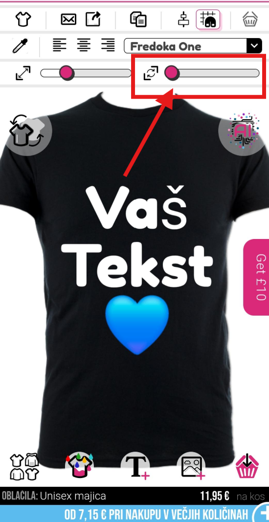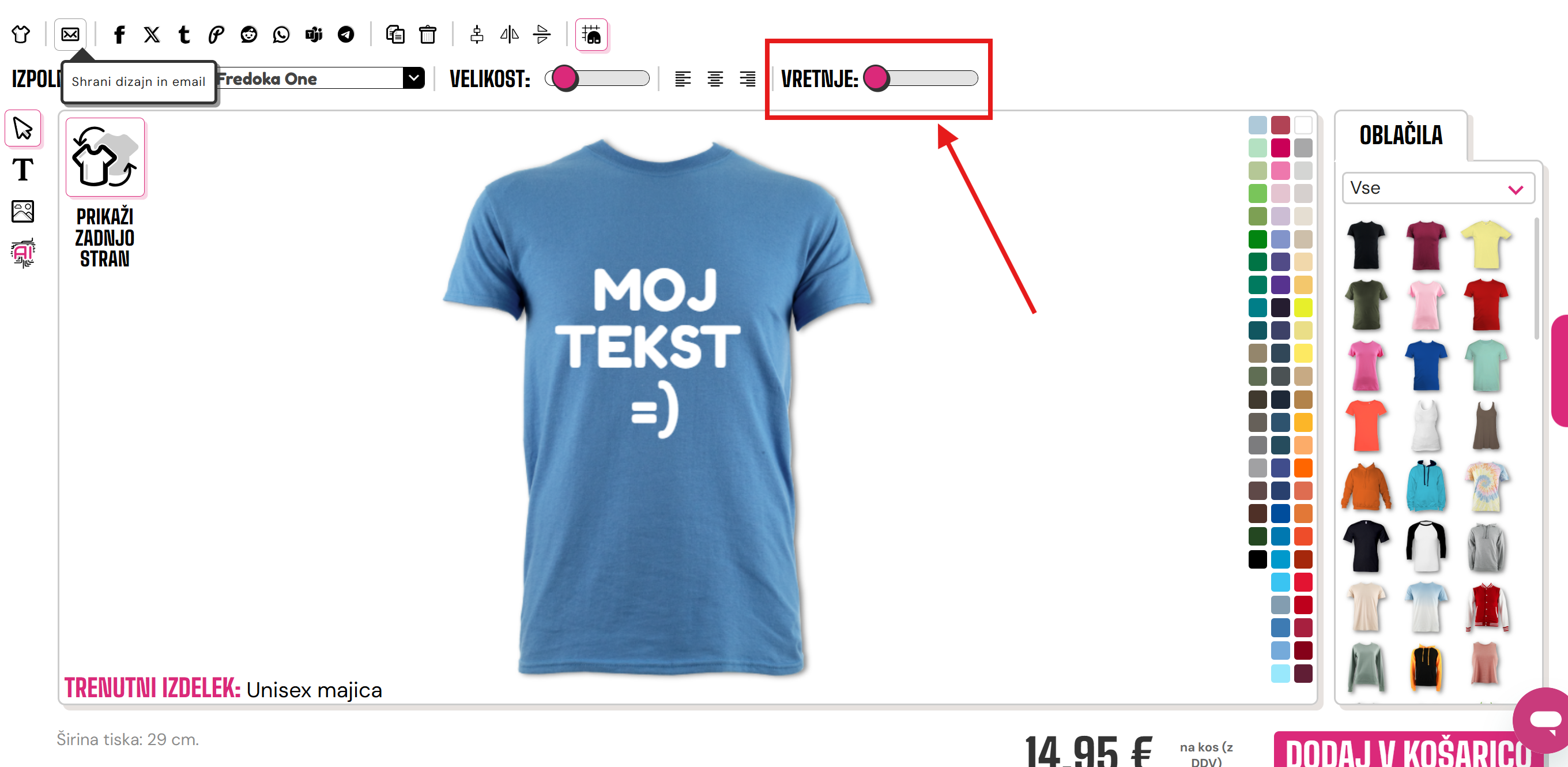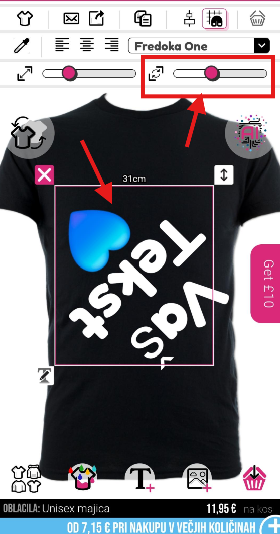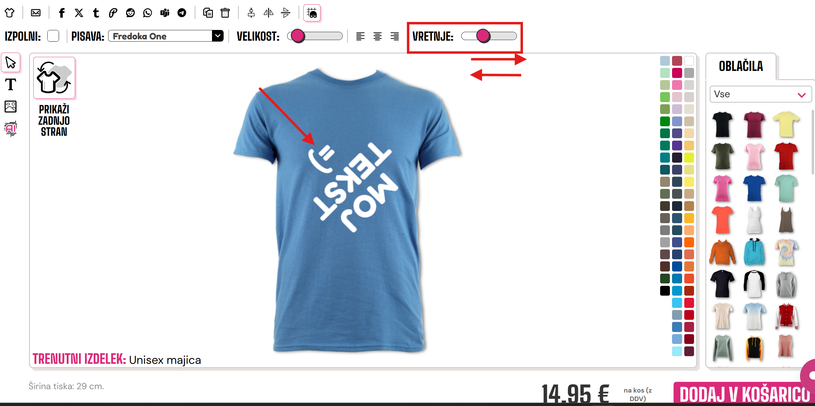 Za vrtenje slike ali besedila boste morali uporabiti miško in drsnik na desni zgornji strani oblikovalnika.