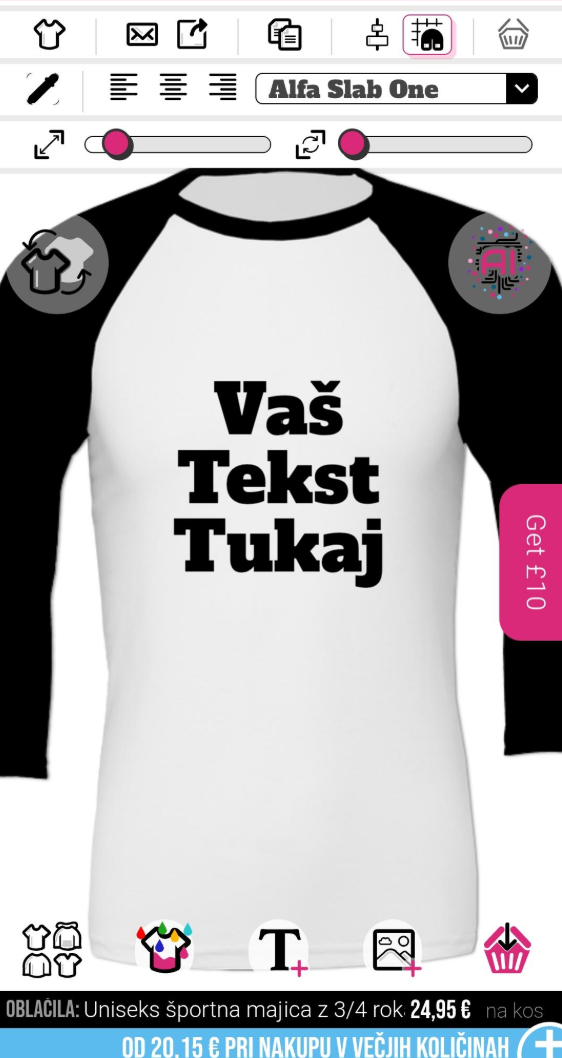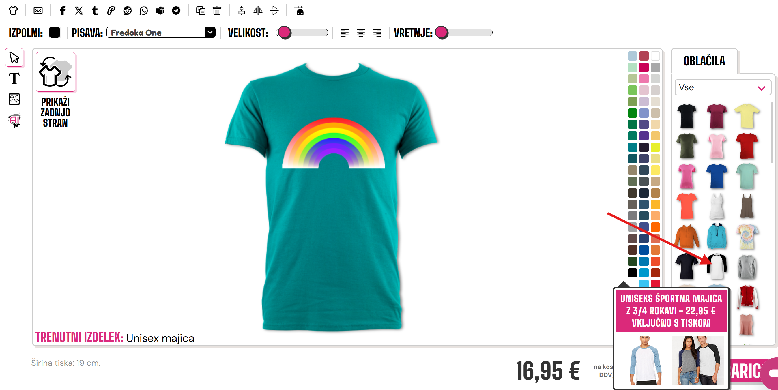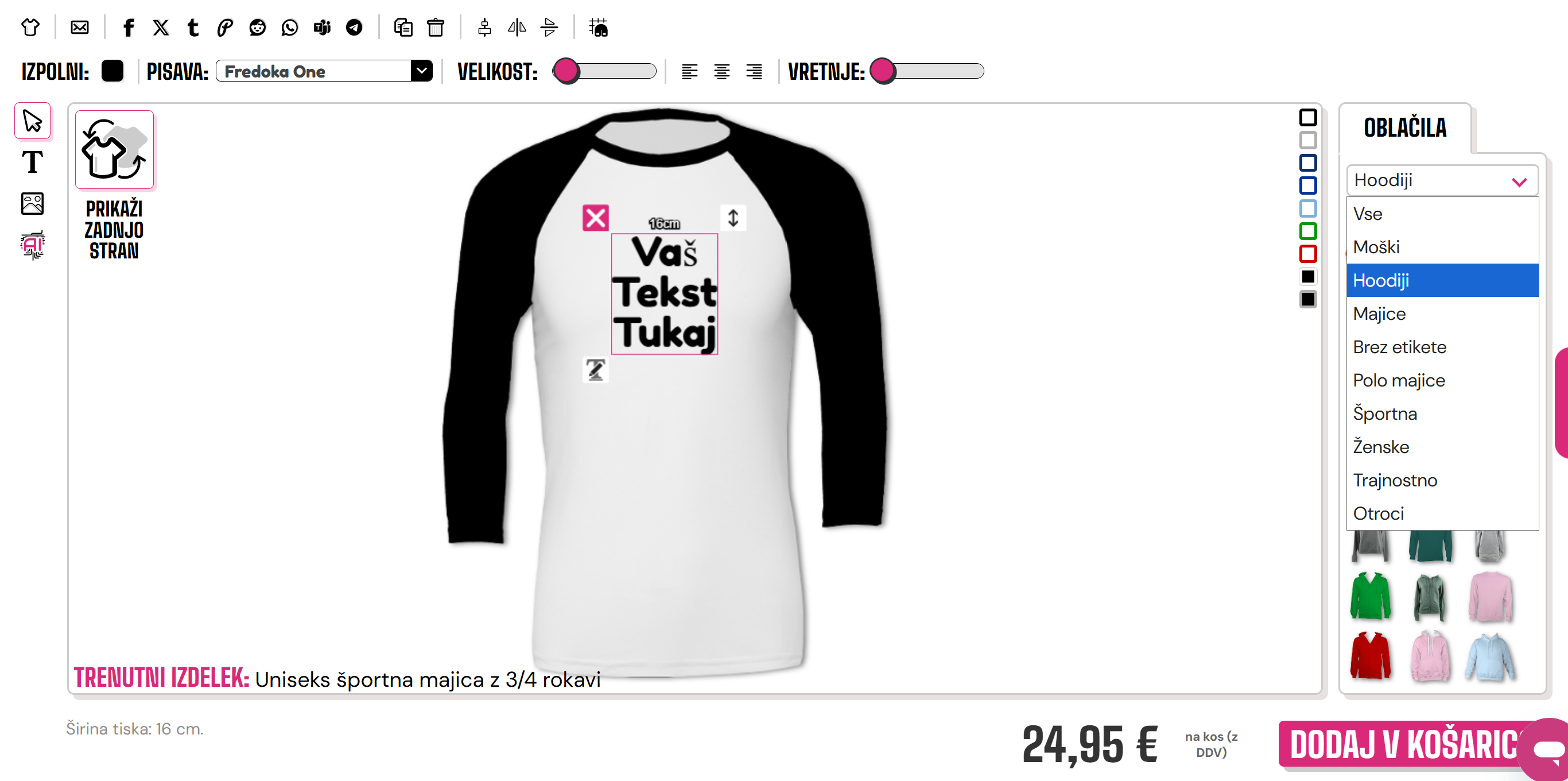Ko se z miško pomaknete nad možnost, se prikaže ime oblačila in cena enostranskega tiska.