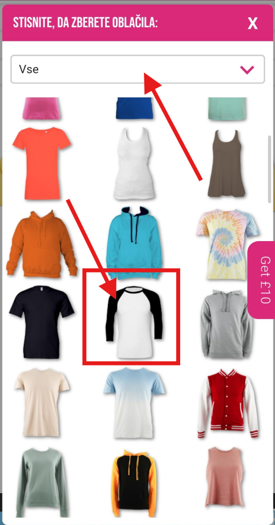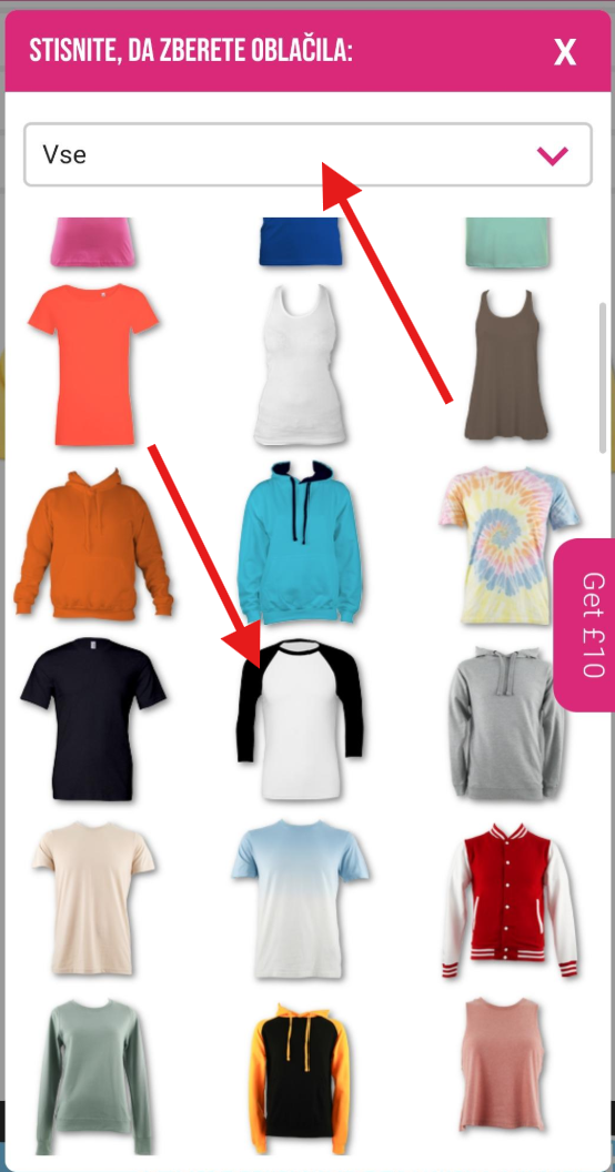 Uporabite lahko spustni meni za izbiro kategorije. Na primer: ne želimo majice, želimo pulover s kapuco. Izberimo pulover s kapuco s seznama. Za pomikanje po celotni izbiri lahko uporabite prst.