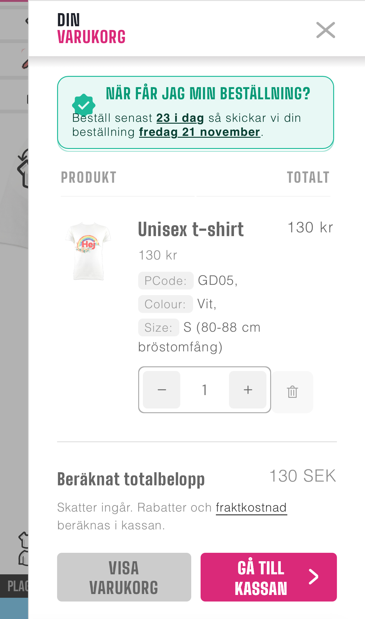 Produkten är nu i din varukorg. Du kan börja designa nästa t-shirt eller gå vidare till kassan.