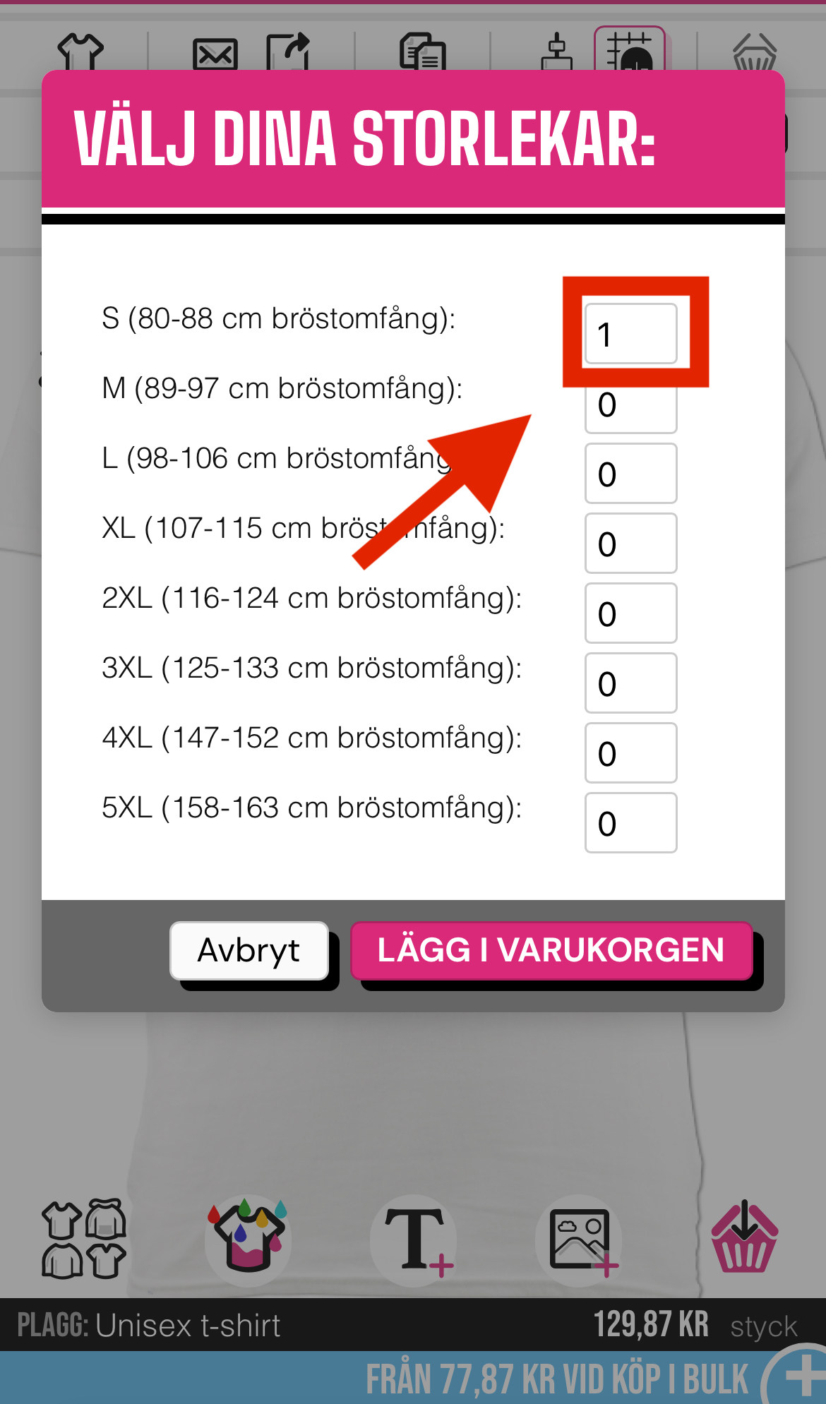 Välj den storlek du vill ha genom att ange det antal du behöver eller trycka på uppåtpilen (denna visas när du håller musen över området) för att öka antalet.