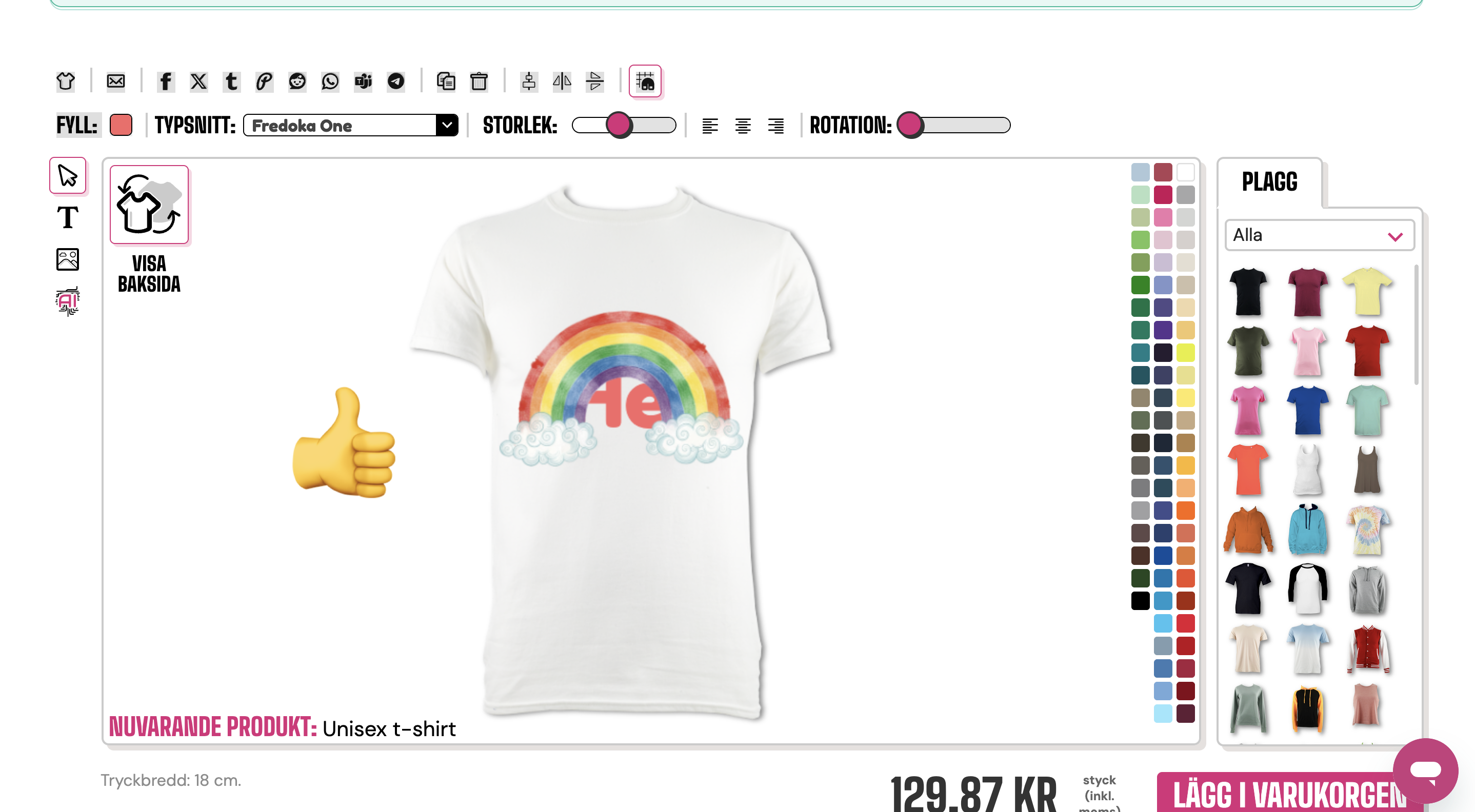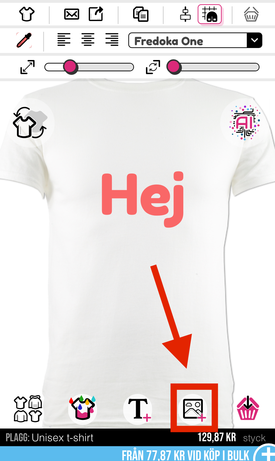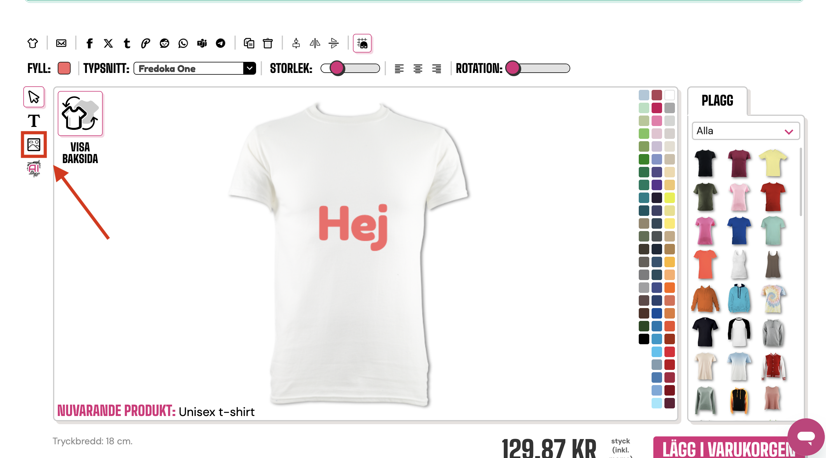 Om du vill lägga till bilder på ditt plagg måste du se till att de är i PNG- eller JPEG-format och är under 20 MB. När du är redo att ladda upp behöver du klicka på knappen för att lägga till bilder. (denna ser ut som kullar och moln och finns precis under "T" på vänster sida av designverktyget)