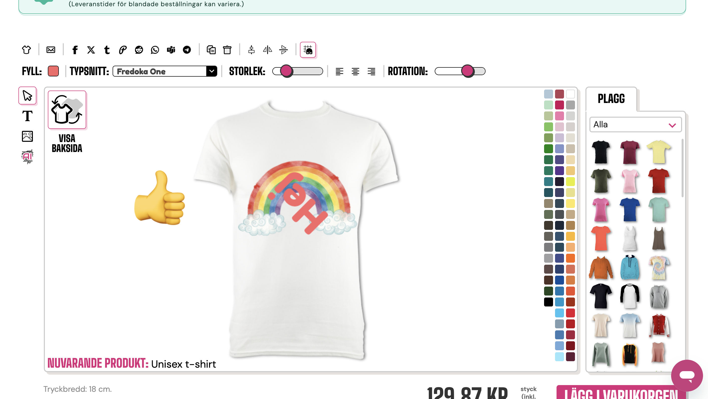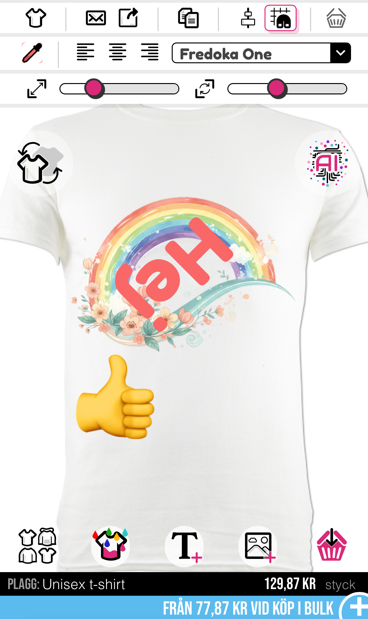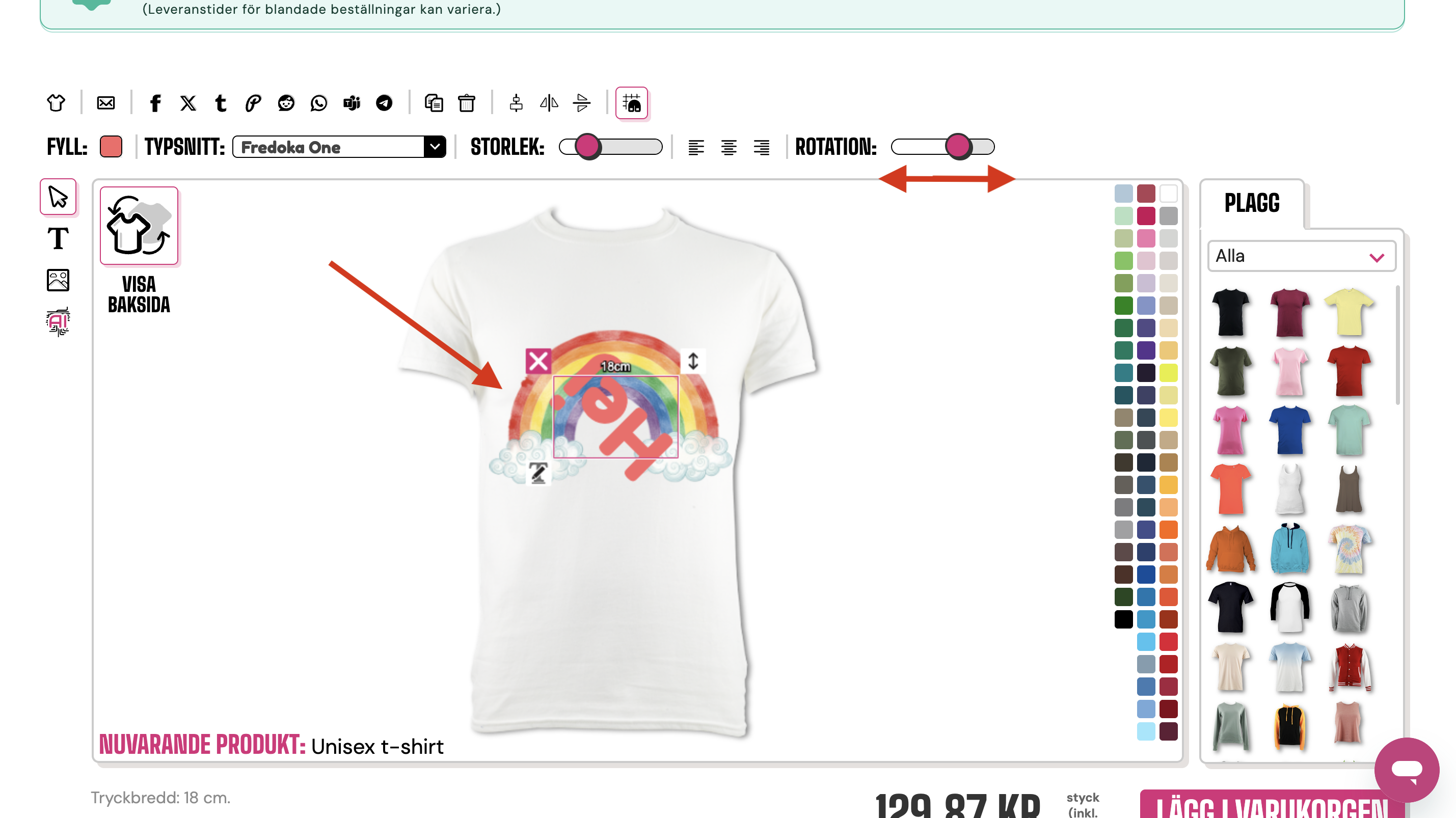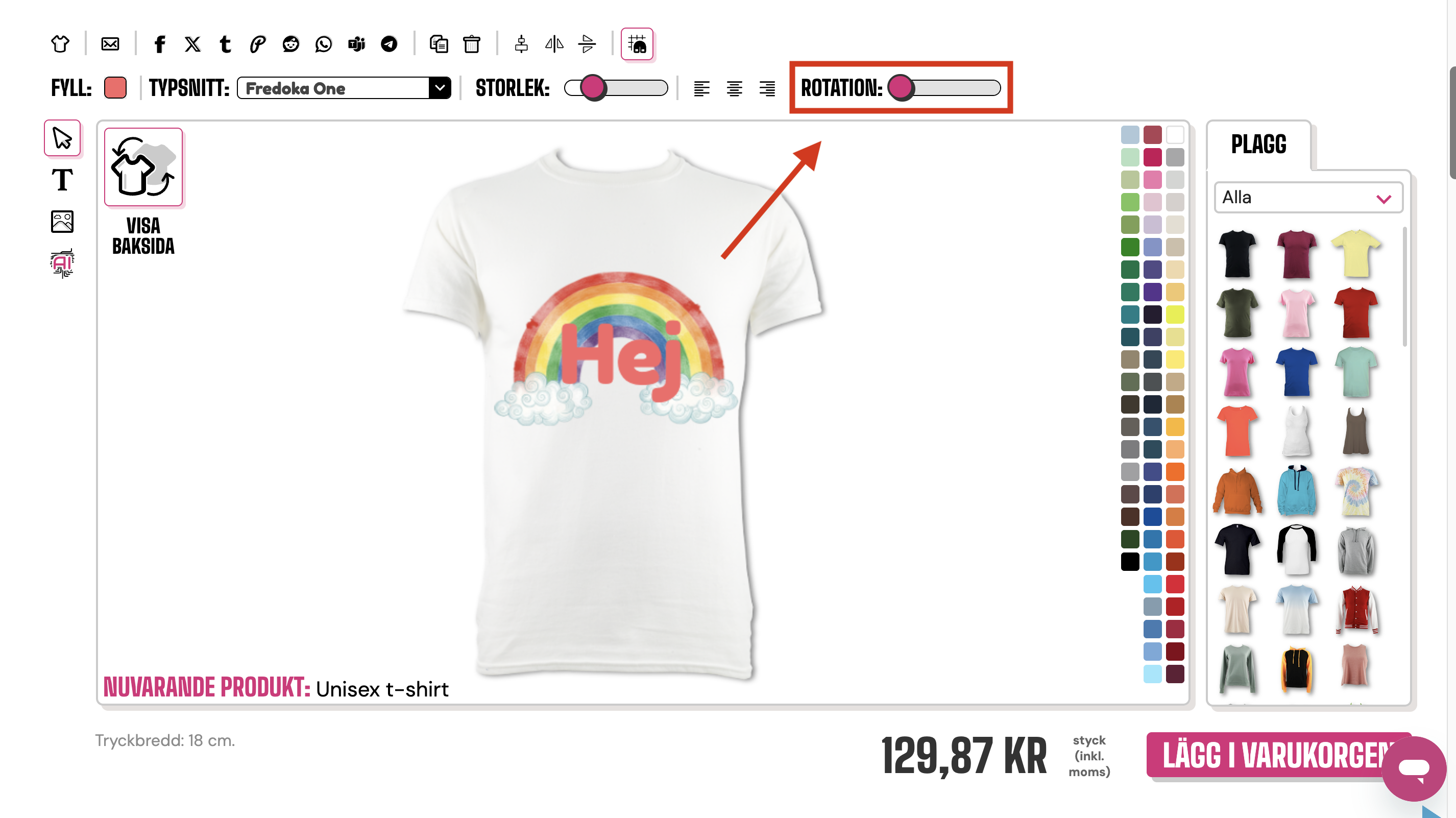 För att rotera en bild eller text behöver du använda fingret och dra i rotationsreglaget längst upp till höger i designverktyget.