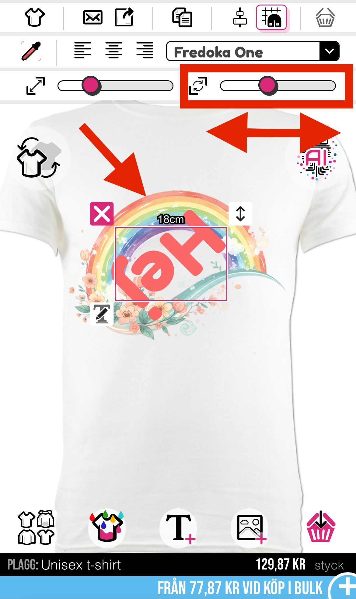 För att rotera en bild eller text behöver du använda musen och dra i skjutreglaget längst upp till höger i designverktyget.