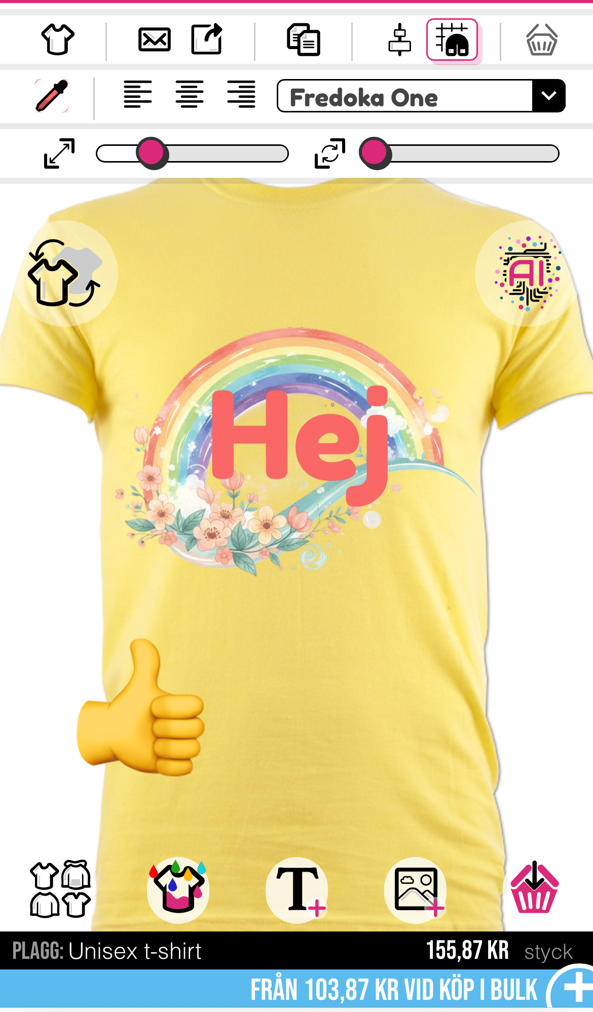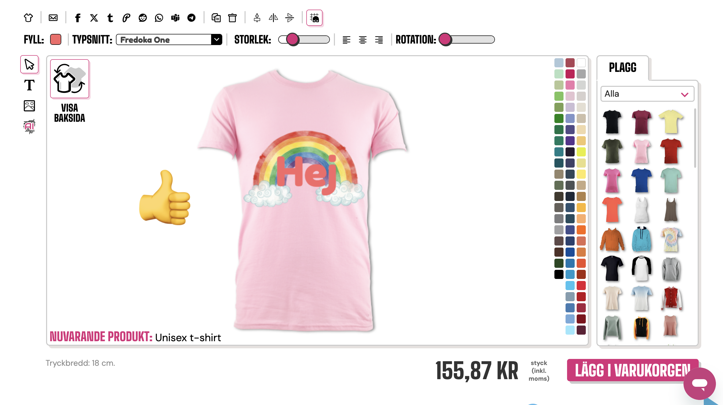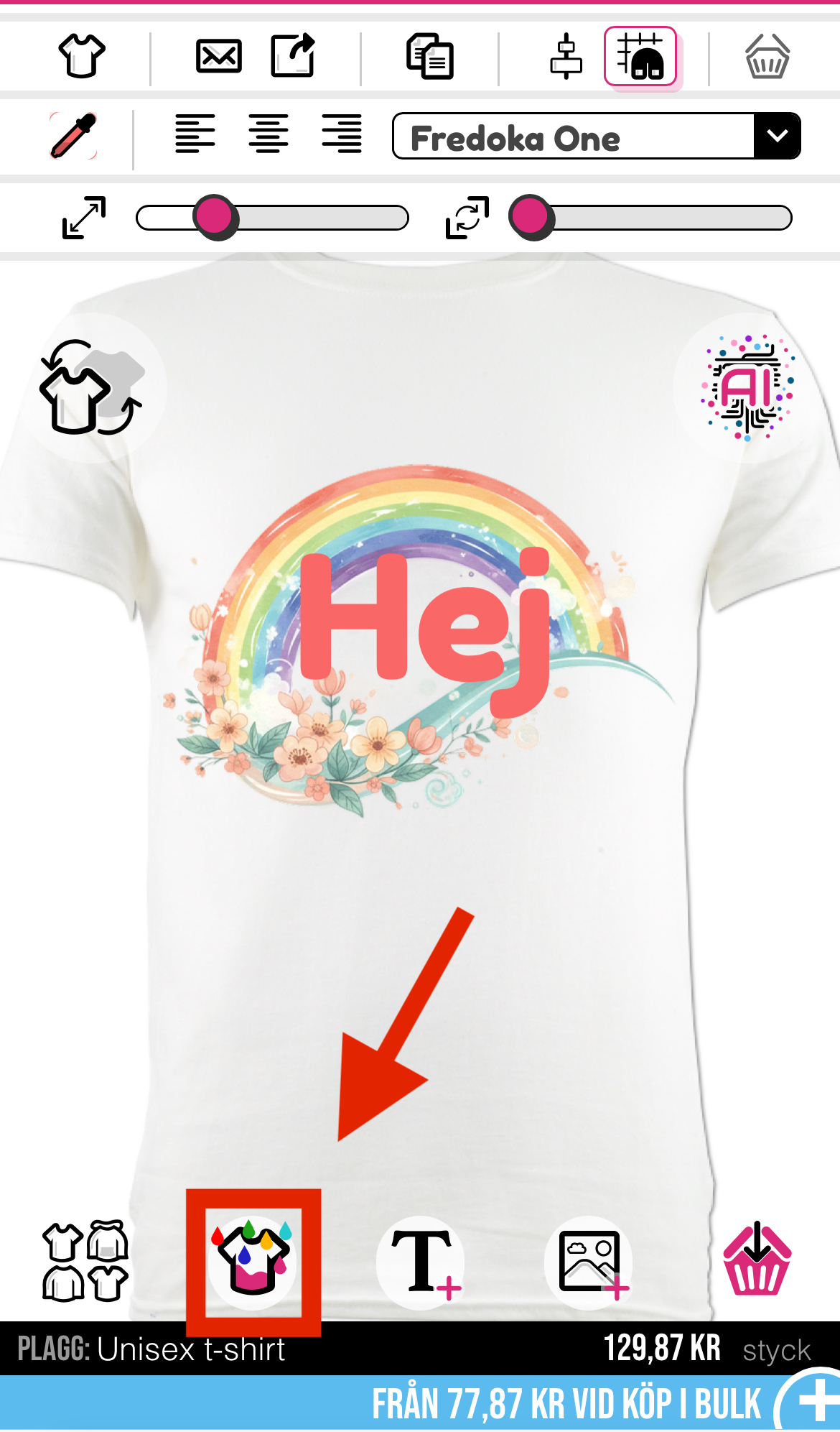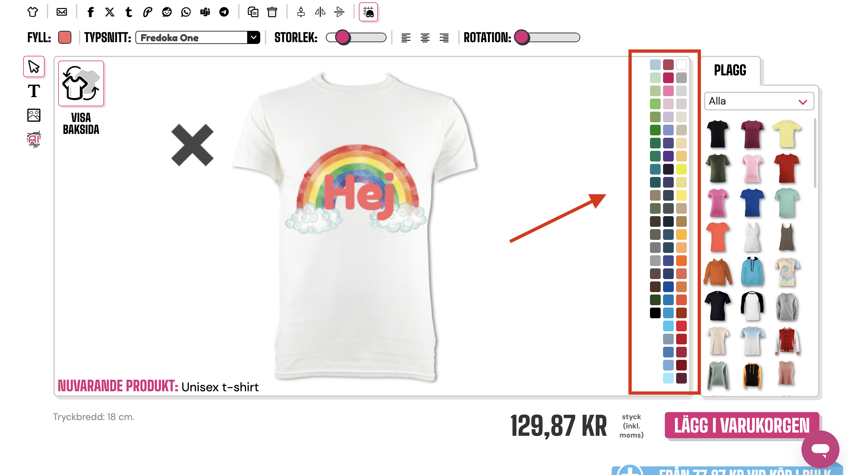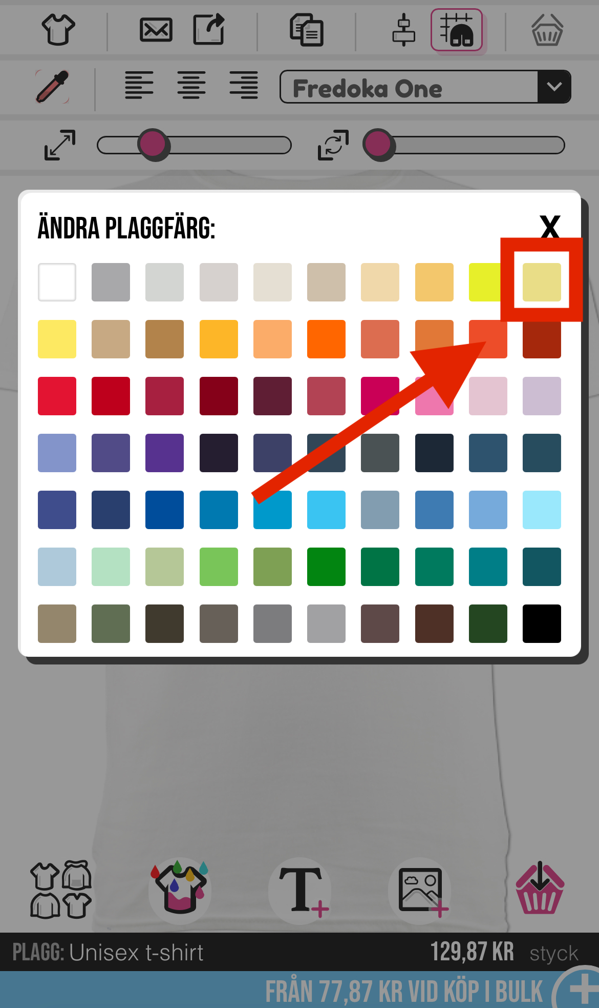 För att ändra färg på ditt plagg behöver du välja t-shirtfärgsväljaren längst ner i designern.
