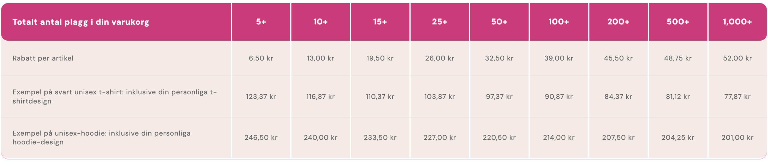Rabatter för stora beställningar börjar redan vid 5 artiklar i din korg (dessa kan vara i vilken storlek, stil eller färg som helst). Du hittar rabattabellen för stora beställningar under designern på skapa och köp T-shirts.